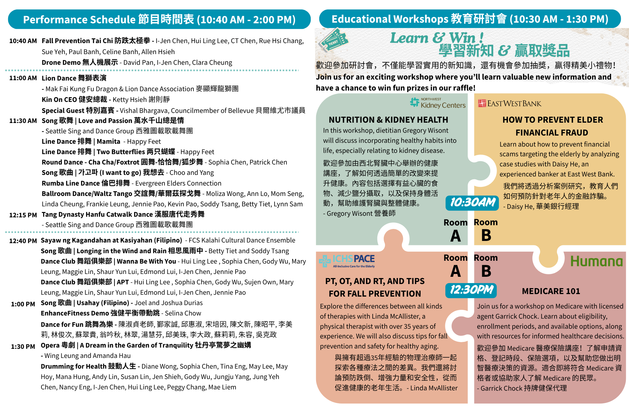 活動現場還設有豐富的社區資源攤位,包括健康照護、法律援助、日常生活支援等服務,並有多個政府單位參與,為長者提供生活所需的重要資訊。除了資源攤位外,我們也安排了多場實用專題講座,涵蓋多個與長者福祉息息相關的主題,包括營養與腎臟健康,預防長者金融詐騙,物理治療、職能治療與復健治療的差異及防跌技巧,醫療保險 Medicare 101。
